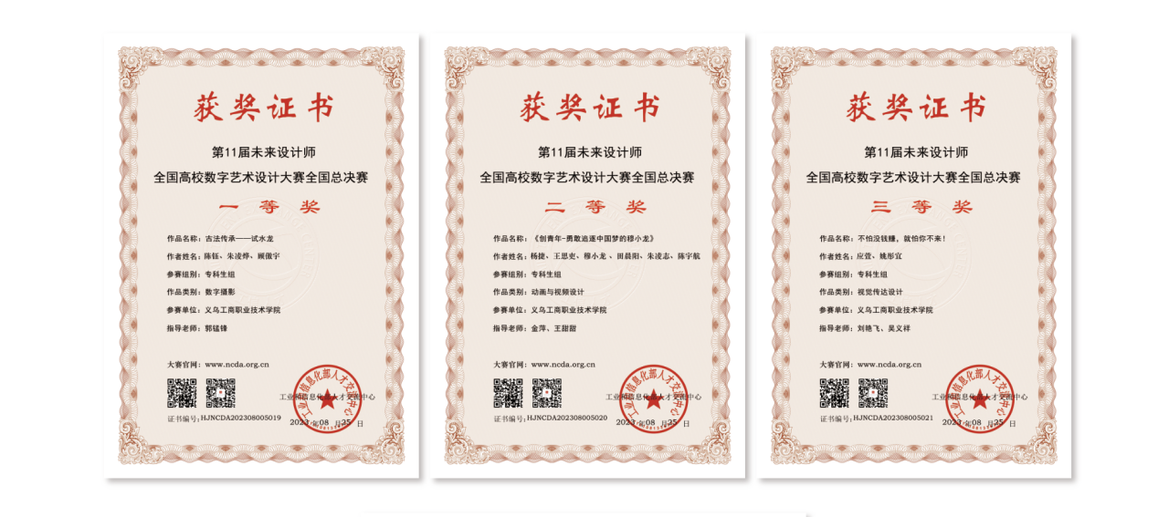 学生陈钰、朱凌烨、顾傲宇的作品《古法传承——试水⻰》(指导老师:郭锰锋)获全国一等奖。学生杨捷、王思吏、穆小⻰ 、田晨阳、朱凌志、陈宇航的作品《创⻘年-勇敢追逐中国梦的穆小⻰》(指导老师:金萍、王甜甜)获全国二等奖。学生应萱、姚彤宜的作品《不怕没钱赚,就怕你不来!》(指导老师刘艳⻜、吴义祥)获全国三等奖。同时郭锰锋老师获国赛优秀指导教师奖。全国总决赛二等奖及以上作品将参加由联合国教科文组织主办的未来设计师·国际创新设计大赛IIDA国际赛。